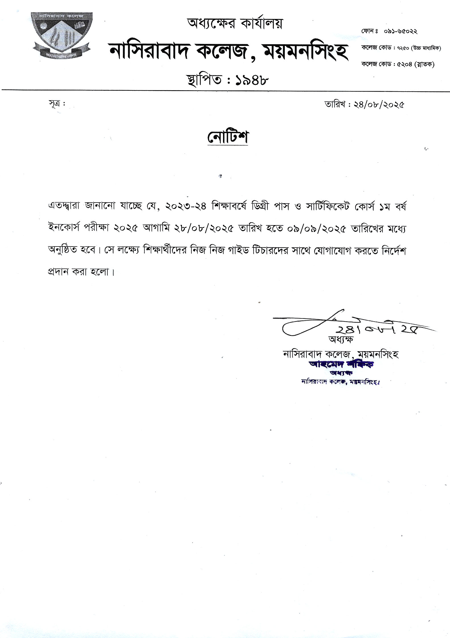 ২০২৩-২৪ শিক্ষাবর্ষে ডিগ্রী পাস ১ম বর্ষ ইনকোর্স পরীক্ষা ২০২৪ এর সময়সূচি