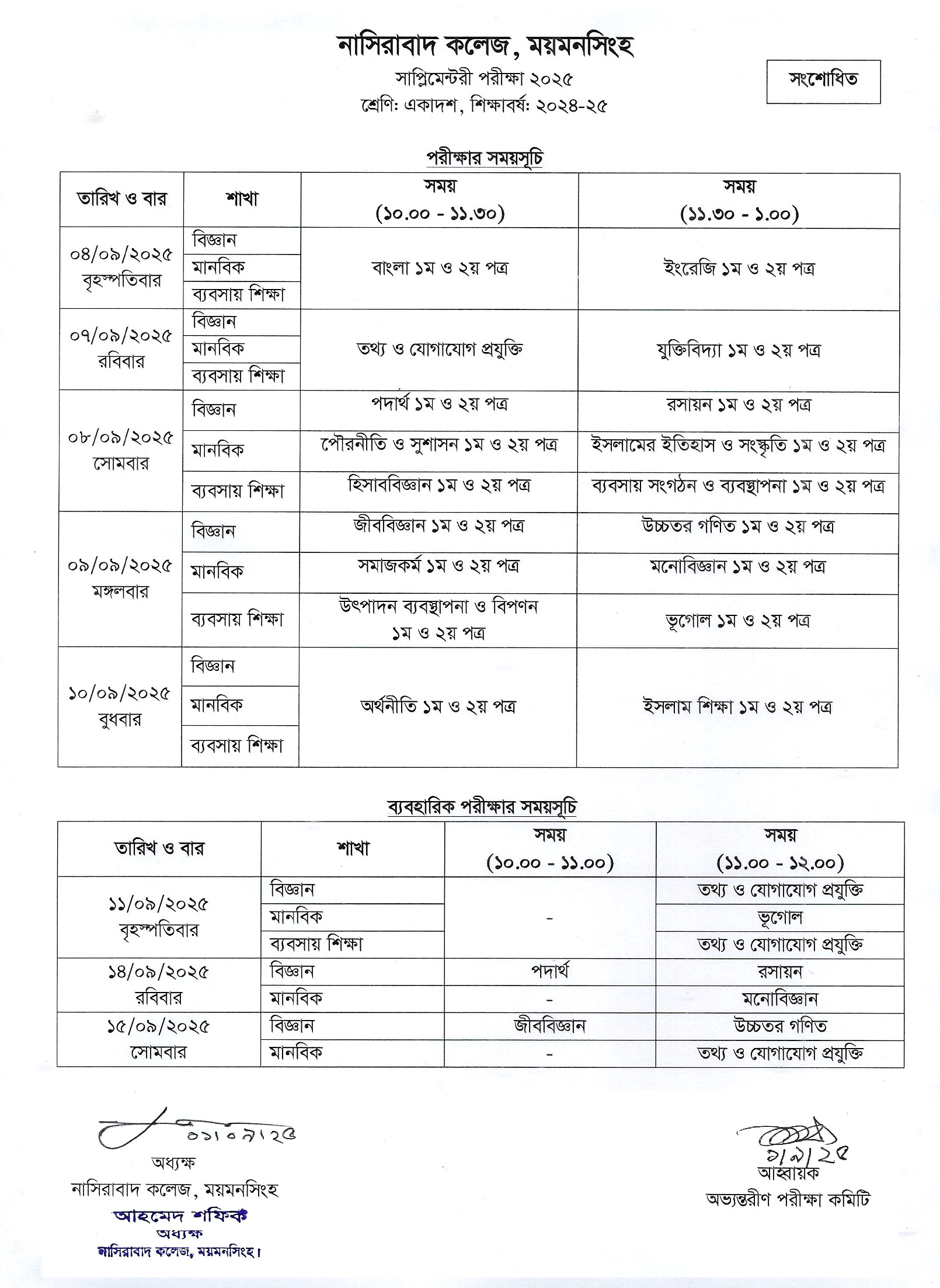 ২০২৪-২৫ শিক্ষাবর্ষে একাদশ শ্রেণির সাপ্লিমেন্টারি পরীক্ষার সংশোধিত সময়সূচি