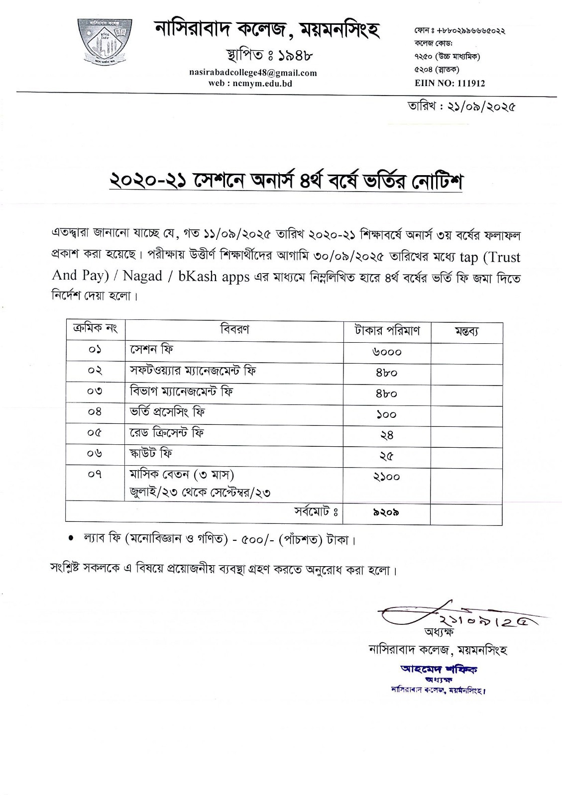 ২০২০-২১ সেশনে অনার্স ৪র্থ বর্ষে ভর্তির বিজ্ঞপ্তি