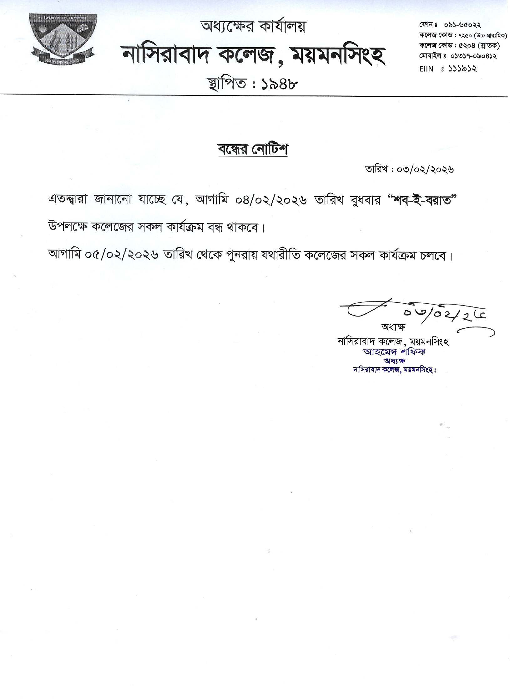 “ত্রয়োদশ জাতীয় সংসদ নির্বাচন ” এবং “শ্রী শ্রী শিবরাত্রি ব্রত” উপলক্ষে কলেজ বন্ধের নোটিশ