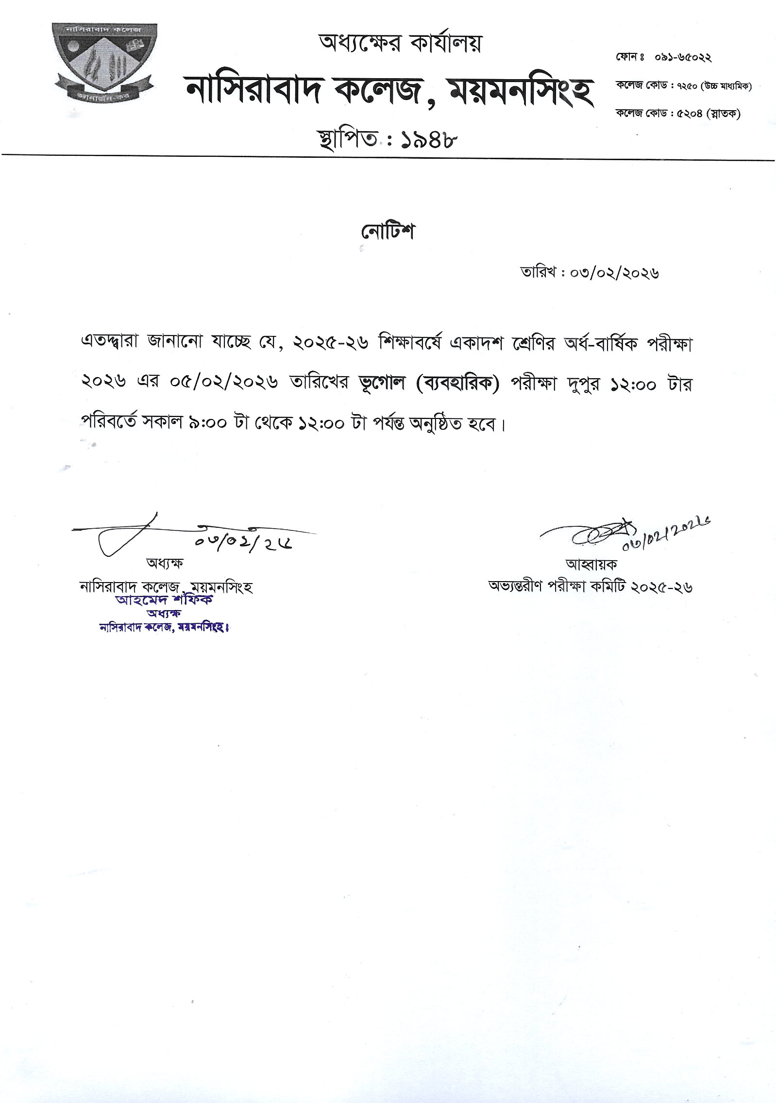 ২০২৫-২৬ শিক্ষাবর্ষে একাদশ শ্রেণির অর্ধ -বার্ষিক পরীক্ষা ২০২৬ এর ফলাফল প্রকাশ সংক্রান্ত নোটিশ