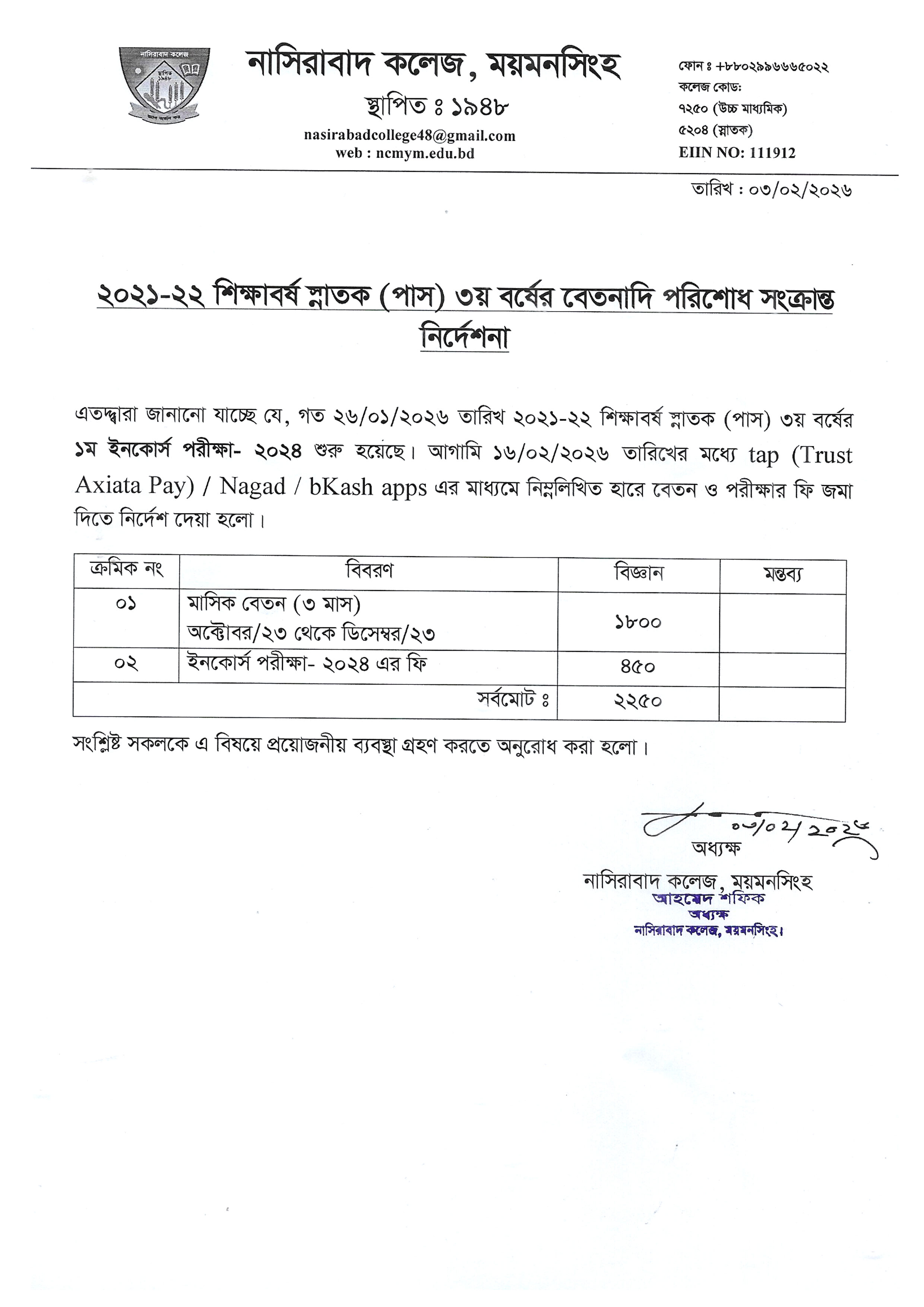 ২০২৩-২৪ শিক্ষাবর্ষ স্নাতক (সম্মান) ২য় বর্ষের বেতনাদি পরিশোধ সংক্রান্ত নির্দেশনা
